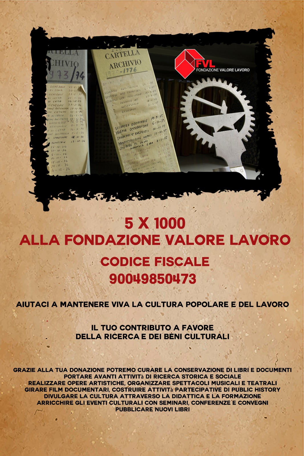 In tal modo il vostro contributo andrà a sostenere tutte le attività culturali, artistiche, di ricerca storica e sociale e di tenuta del nostro archivio e della nostra biblioteca che la FVL, insieme alla CGIL di Pistoia, porta avanti.