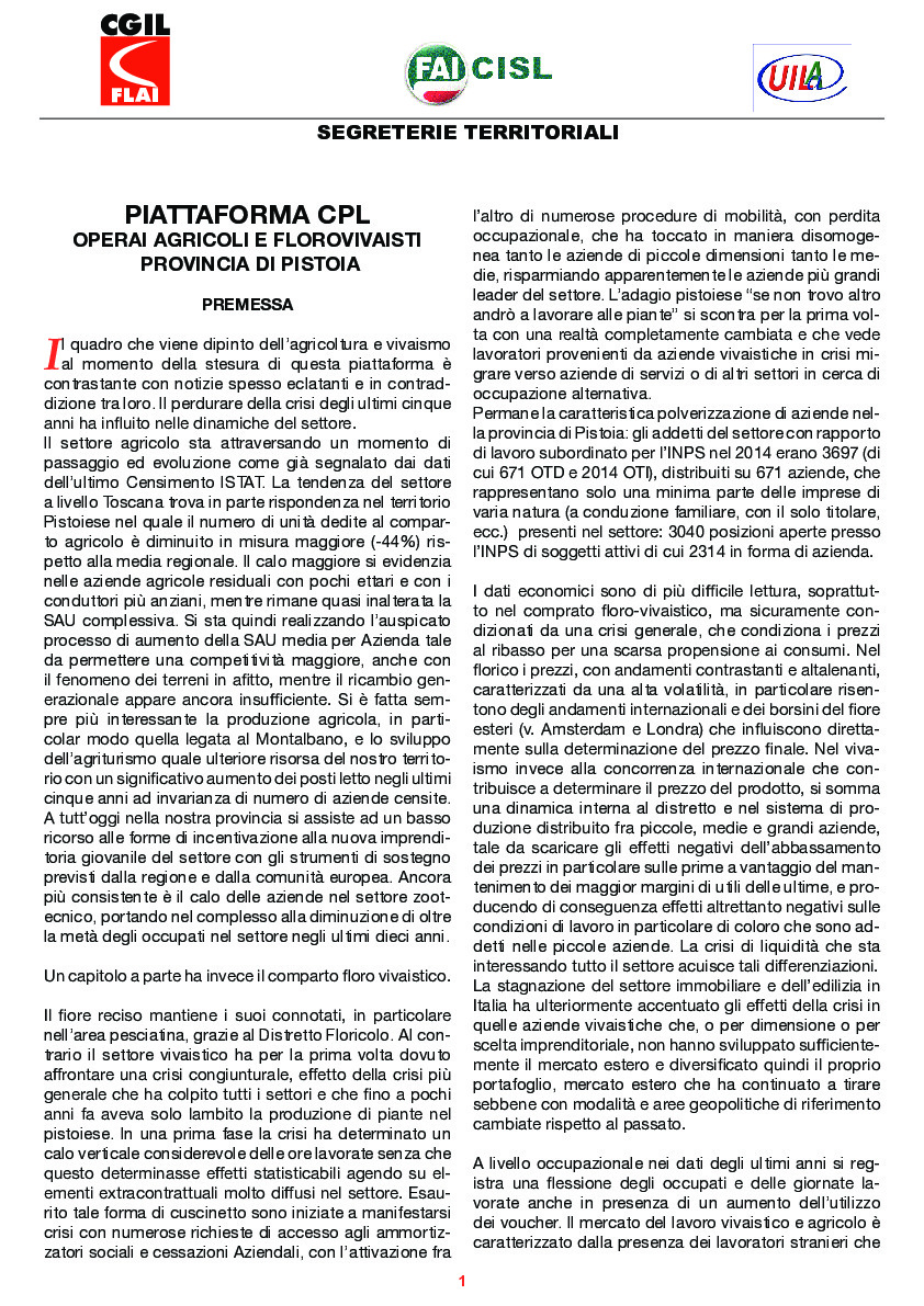 Piattaforma delle Segreterie territoriali di FLAI-CGIL FAI-CISL UILA-UIL per il rinnovo del Contratto Provinciale di Lavoro (CPL) per gli addetti delle imprese agricole e florovivaiste della Provincia di Pistoia. Versione iscritti FLAI CGIL.