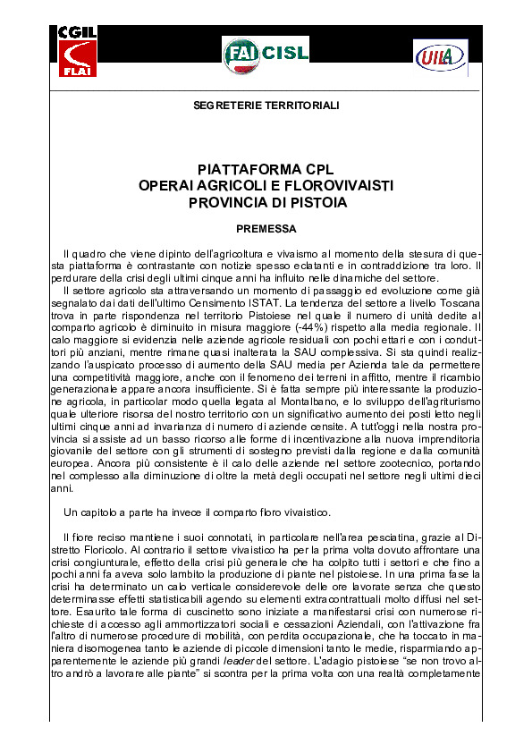 Piattaforma delle Segreterie territoriali di FLAI-CGIL FAI-CISL UILA-UIL per il rinnovo del Contratto Provinciale di Lavoro (CPL) per gli addetti delle imprese agricole e florovivaiste della Provincia di Pistoia