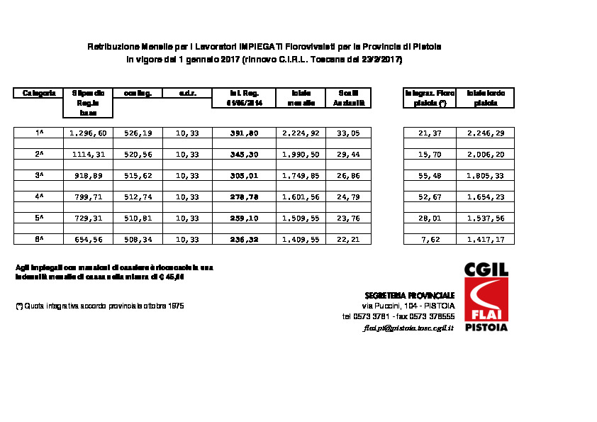 Retribuzioni Impiegati Florovivaisti Pistoia (CIRL Toscana 01 01 2017)