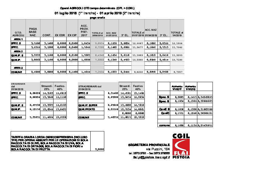 Tabelle paga oraria degli operai agricoli a tempo determinato (OTD) e a tempo indeterminato (OTI) della provincia di Pistoia comprensiva della quota ricalcolata del rinnovo del CCNL del 2018. Vigenza economica dal 01/07/2018 al 31/12/2019 (scadenza CPL). Formato PDF.