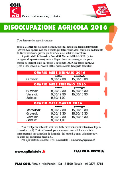 Volantino in lingua italiana per la campagna di disoccupazione agricola 2016 della FLAI CGIL. Formato PDF A5 a colori fronte retro.