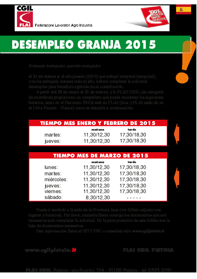 Flyer en español para la campaña de 2015, el desempleo agrícola FLAI CGIL . PDF A4 de color dúplex.