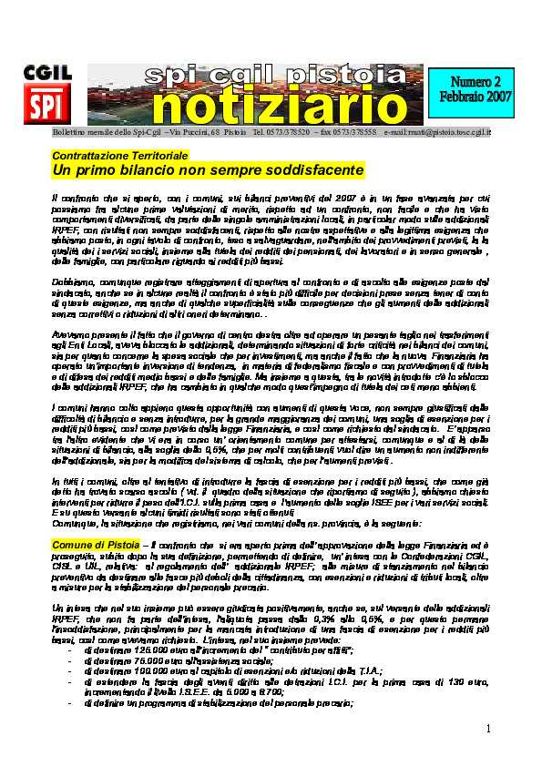 Notiziario SPI CGIL Pistoia anno IV nr 2 del febbraio 2007
