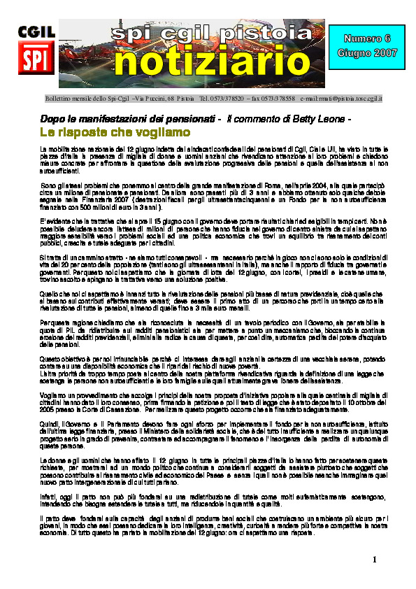 Notiziario SPI CGIL Pistoia anno IV nr 6 del giugno 2007