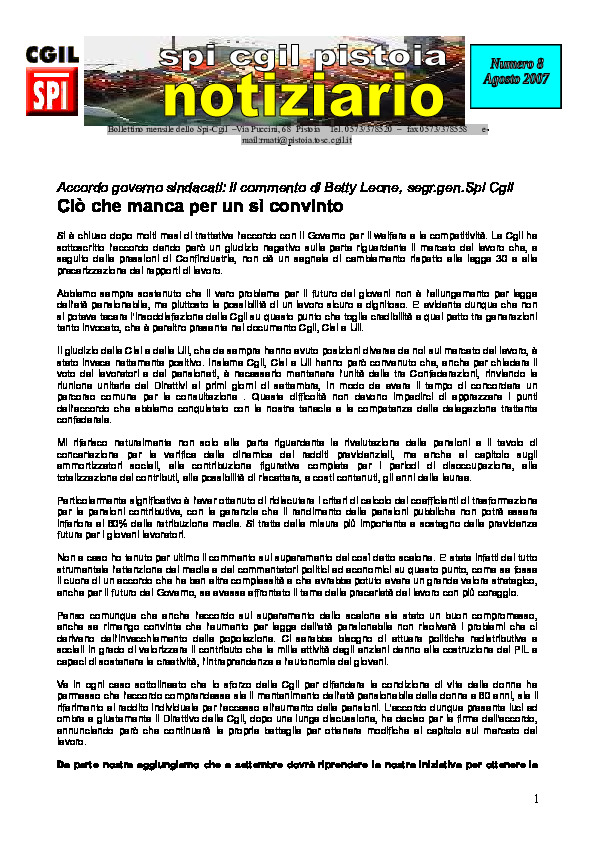 Notiziario SPI CGIL Pistoia anno IV nr 8 del agosto 2007