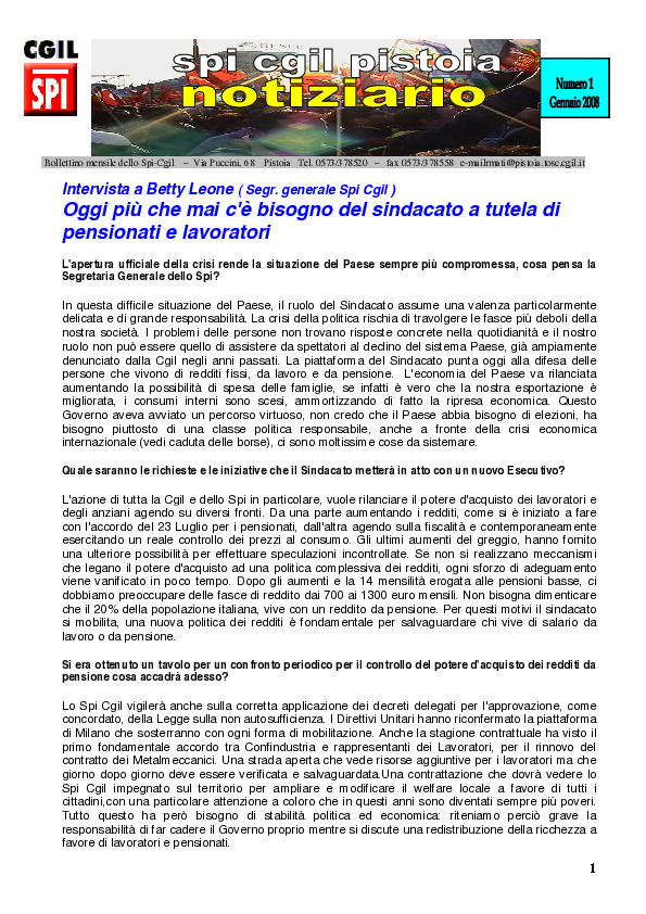 Notiziario SPI CGIL Pistoia anno V nr 1 del gennaio 2008