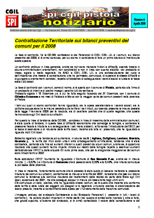Notiziario SPI CGIL Pistoia anno V nr 4 dell'aprile 2008