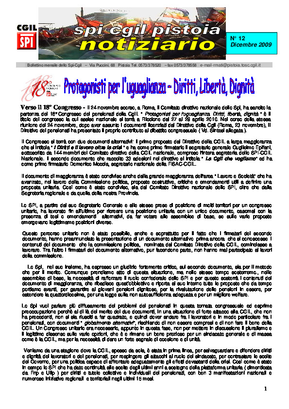 Notiziario SPI CGIL Pistoia anno VI nr 11 del dicembre 2009