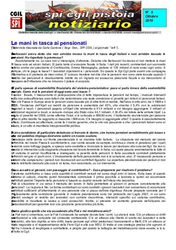 Notiziario SPI CGIL Pistoia anno VII nr 8 dell'ottobre 2010