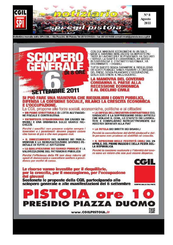 Notiziario SPI CGIL Pistoia anno VIII nr 8 dell'agosto 2011