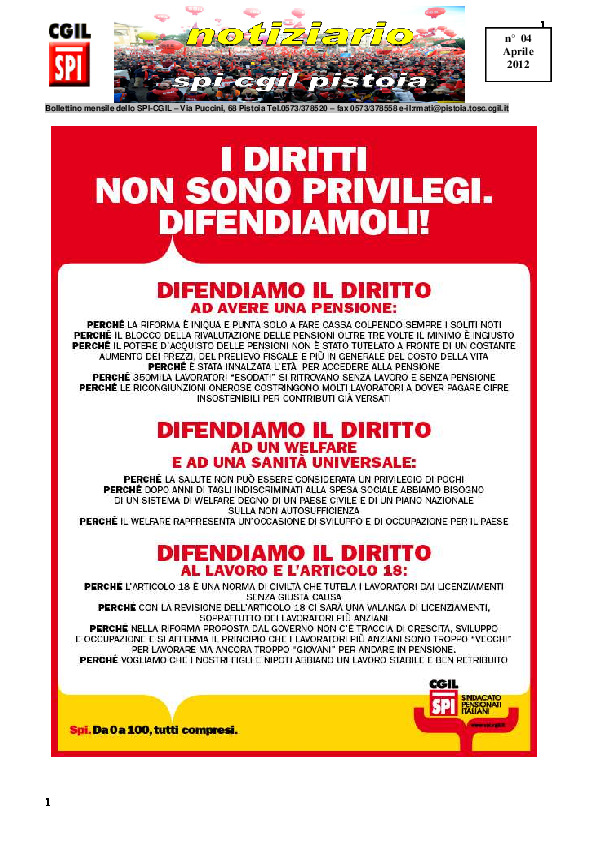 Notiziario SPI CGIL Pistoia anno IX nr 4 dell'aprile 2012