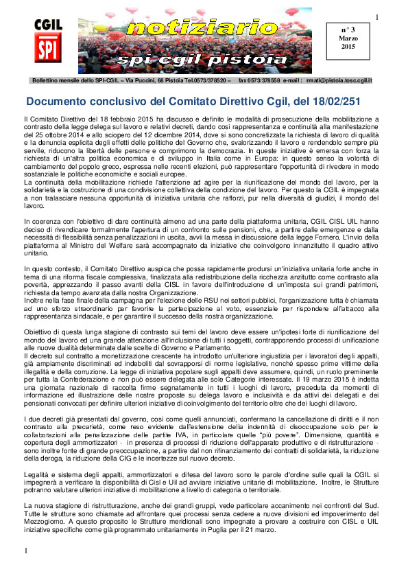 Notiziario SPI CGIL Pistoia anno XII nr 3 del marzo 2015