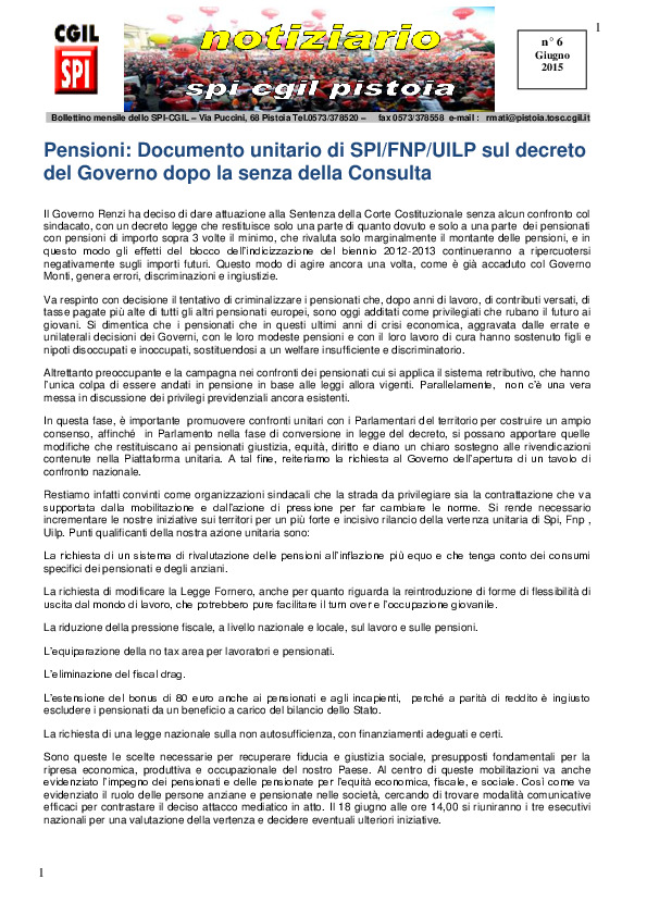 Notiziario SPI CGIL Pistoia anno XII nr 6 del giugno 2015