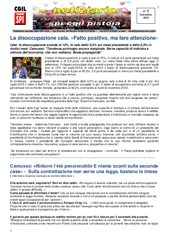 Notiziario SPI CGIL Pistoia anno XII nr 9 del settembre 2015