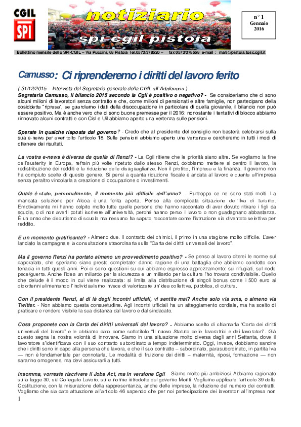Notiziario SPI CGIL Pistoia anno XIII nr 1 del gennaio 2016