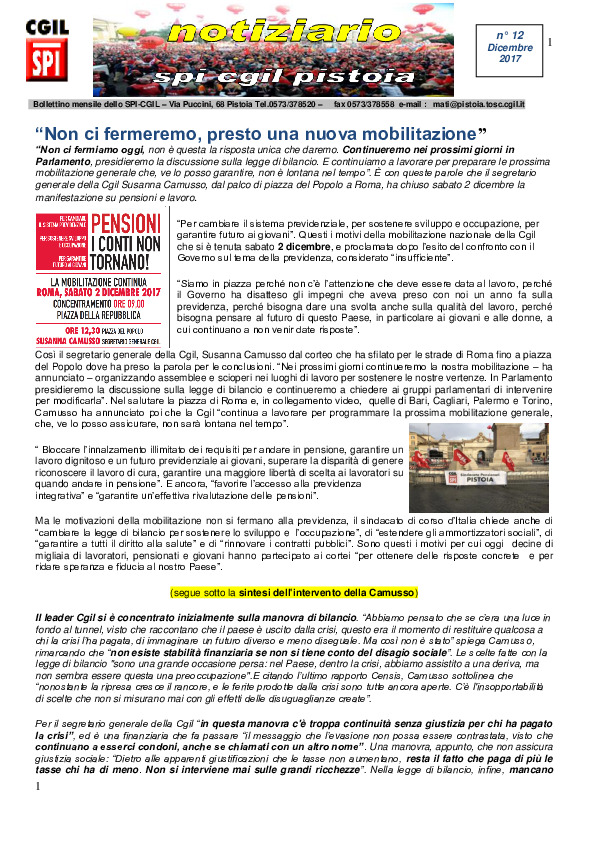 Notiziario SPI CGIL Pistoia anno XIV nr 12 del dicembre 2017