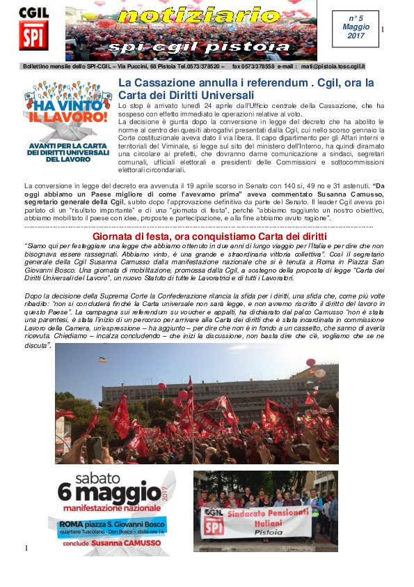 Notiziario SPI CGIL Pistoia anno XIV nr 5 del maggio 2017