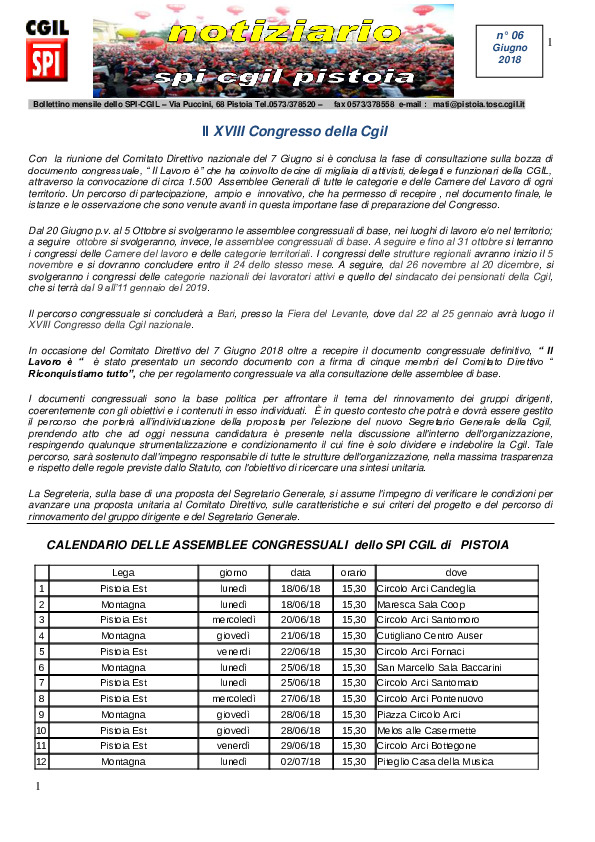Notiziario SPI CGIL Pistoia anno XV nr 6 del giugno 2018