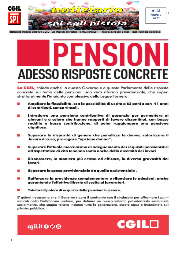 Notiziario SPI CGIL Pistoia anno XV nr 8 dell'agosto 2018
