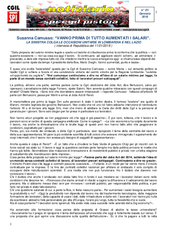 Notiziario SPI CGIL Pistoia anno XV nr 1 del gennaio 2018