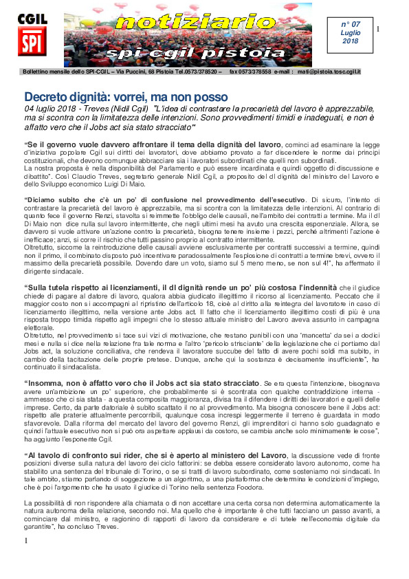 Notiziario SPI CGIL Pistoia anno XV nr 7 del luglio 2018