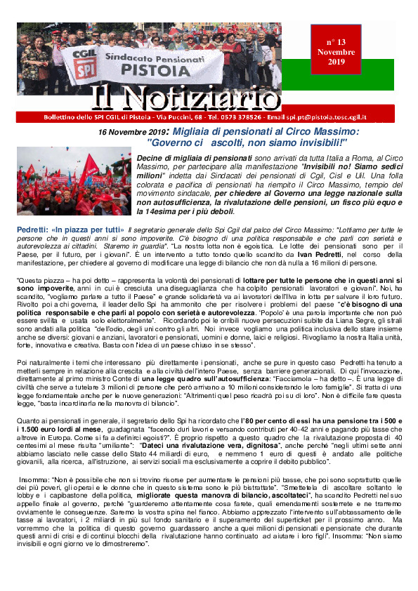 Notiziario SPI CGIL Pistoia anno XVI nr 13 del novembre 2019