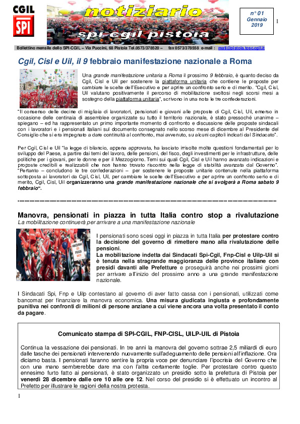 Notiziario SPI CGIL Pistoia anno XVI nr 1 del gennaio 2019