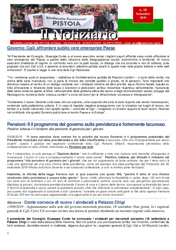 Notiziario SPI CGIL Pistoia anno XVI nr 10 del settembre 2019