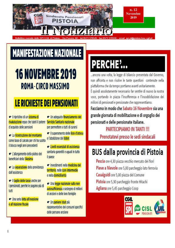 Notiziario SPI CGIL Pistoia anno XVI nr 12 del novembre 2019