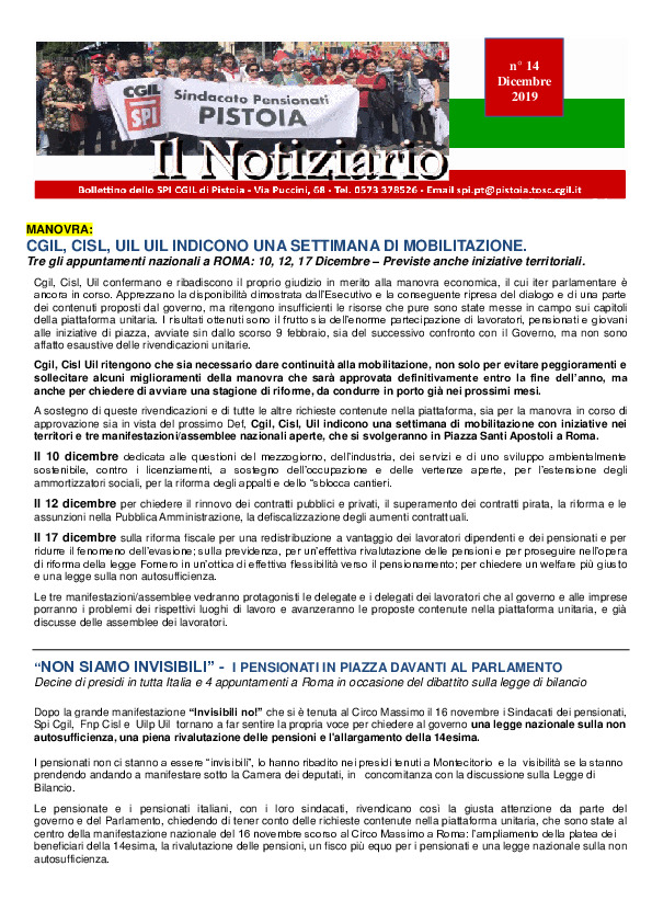 Notiziario SPI CGIL Pistoia anno XVI nr 14 del dicembre 2019