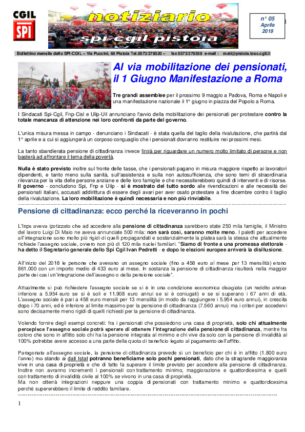 Notiziario SPI CGIL Pistoia anno XVI nr 5 dell'aprile 2019