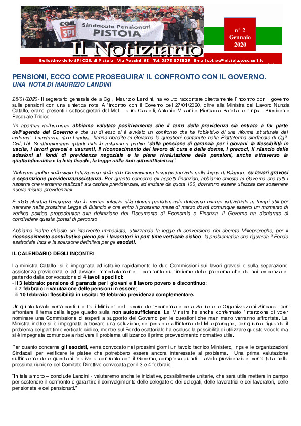 Notiziario SPI CGIL Pistoia anno XVII nr 2 del gennaio 2020