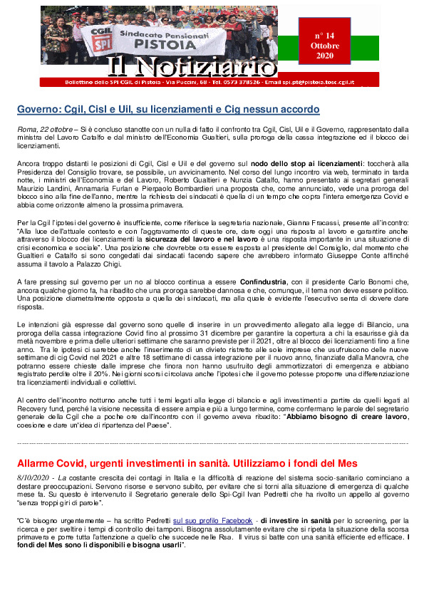 Notiziario SPI CGIL Pistoia anno XVII nr 14 dell'ottobre 2020