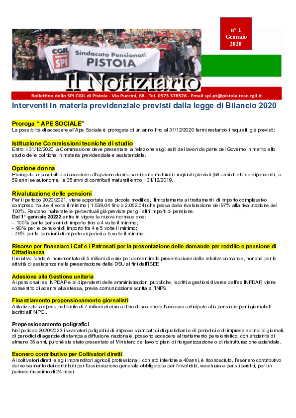 Notiziario SPI CGIL Pistoia anno XVII nr 1 del gennaio 2020
