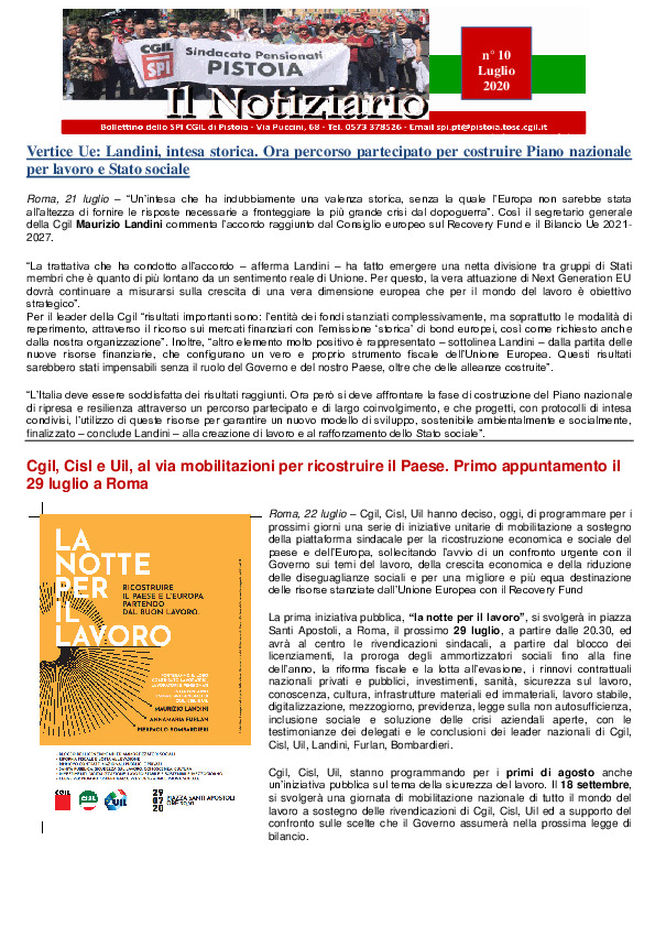 Notiziario SPI CGIL Pistoia anno XVII nr 10 del luglio 2020