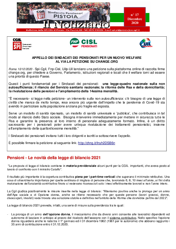 Notiziario SPI CGIL Pistoia anno XVII nr 17 del dicembre 2020