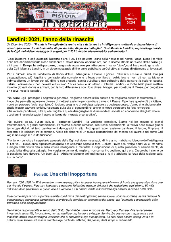 Notiziario SPI CGIL Pistoia anno XVIII nr 1 del gennaio 2021