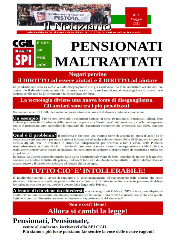 Notiziario SPI CGIL Pistoia anno XVIII nr 9 del maggio 2021