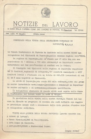 In Camera del Lavoro a Pistoia, infatti ancora ricordiamo, i tanti anni di gemellaggio sindacale con quella città, all’epoca conosciuta come Zaporoje, iniziato nel lontano 1969 ad opera dell’ora Segretario Giuliano Lucarelli, all’insegna dell’amicizia tra i popoli e che per circa un ventennio ha dato vita a visite reciproche di delegazioni sindacali e scambi culturali, di cui nei nostri archivi è conservata preziosa testimonianza epistolare e fotografica, disponibile come sempre a chi la voglia consultare.